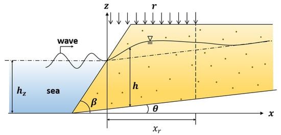 The schematic of the present study is depicted in Figure 1. In the figure, the beach slope of the coastal aquifer is β and the slope of the impermeable bottom base is θ. hz is the average water depth [L], h is the water depth induced by waves and rainfall [L], xr is the cover range of rainfall recharge [L], and r is the recharge rate [L/T].