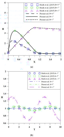 Verification of the present solutions with previous results for groundwater levels under (a) rainfall recharge effect; td = 5 h, r = 15 mm/h. and (b) tidal waves effect; X = 1.