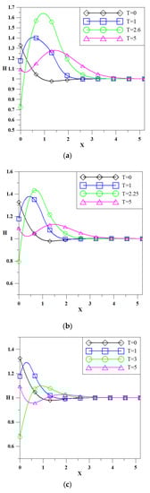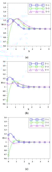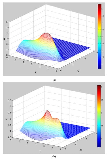 Next, the extensive application of various rainfall recharge effects on groundwater levels is discussed. The mid-peak and double-peak distributed rainfall recharge rates are inputted into the present solution, Equation (31), and the groundwater levels are shown in Figure 3. For example, the rates for the mid-peak case are 10, 15, 20, 25, 30, 25, 20, 15, 10, 5 mm/h, and the rates for the double peak case are 5, 10, 15, 10, 5, 5, 5, 15, 10, 0 mm/h with a total duration td = 10 h. It should be noted that the total accumulative rainfall recharge is different, and the former is larger than the latter. The peak value of groundwater levels in Figure 3a occurs at the location (X,T) = (0.7, 3.15), whereas the first peak in Figure 3b occurs at (X,T) = (0.7, 2.1) and the second one at (X,T) = (0.75, 4.7). Although the two peak recharge rates of the double peak case are the same, the maximum water level occurs at the second peak rather than the first one because of the piling-up effect for the double peak case. Moreover, Figure 3 successfully demonstrates that the present solution can simulate the spatiotemporal variation of groundwater levels in a sloping unconfined aquifer under any randomly distributed rainfall recharge, and this was not done in the work of Hsieh et al. [11].