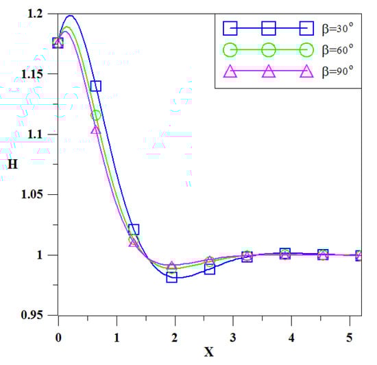 Consequently, the tidal waves’ effect on groundwater levels is investigated. The effect of the beach slope on groundwater levels is shown in Figure 4. In the figure, θ = 0°, β = 30°, 60°, 90° and δ = 0.3386, S = 0.07, K =0.0038 cm/s for silt inside a coastal aquifer are selected, and the result indicates that the water level fluctuates more apparently for a smaller slope. This means more wave energy id transmitted into the aquifer for small slopes. This finding agrees with the results of Hsieh et al. [11]