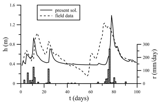 Moreover, to apply the present solution to realistic groundwater problems, an illustration was made, as shown in Figure 7. The aquifer consists of younger alluvial soils in Chiayi County, Taiwan. The rainfall recharge and the field data of the groundwater levels was collected from Liuxi station and Pingxi station of Chiayi County from 2018/07/06 to 2018/10/13, respectively. Referring to Chinchmalatpure et al. [17], the hydraulic conductivity K = 120 cm/day, and the specific yield S = 0.1 were employed. Figure 7 shows that the present solution captures the general pattern of fluctuation, but the solution seems to have a faster response and decay of h. The discrepancy was conjectured to arise from the variability of property of soils. In fact, the hydraulic conductivity in an aquifer is anisotropic and heterogeneous. However, typical values of these two parameters are generally employed for the analytical solutions. Although a discrepancy between the present solution and field data exists, the result could be acceptable. Furthermore, the present analytical solution could be helpful for the verification of a new developed numerical model.