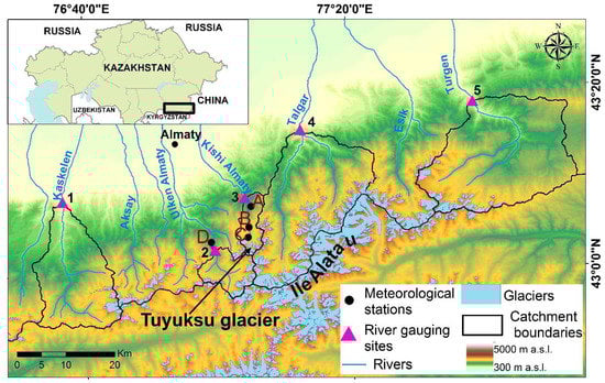 The five modelled catchments of the rivers Kishi Almaty, Ulken Almaty, Turgen, Talgar, and Kaskelen are located on the northern slope of the Ile (Zailiiskiy) Alatau Range (Figure 1). The region is characterized by strong seasonal variations in temperature and precipitation. The westerly flow dominates in autumn and spring resulting in the precipitation maxima in April–May on the plains shifting towards June–July in the middle and high mountains, where snow accumulation peaks in spring and early summer. In winter, the western extension of the Siberian anticyclone predetermines sub-zero temperatures and small amounts of solid precipitation. In summer, the thermal Asiatic depression dominates driving advection from the south which results in hot and dry weather on the plains and high demand for irrigation water [33].
