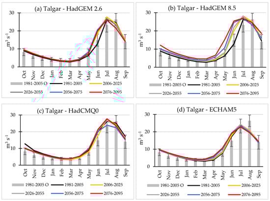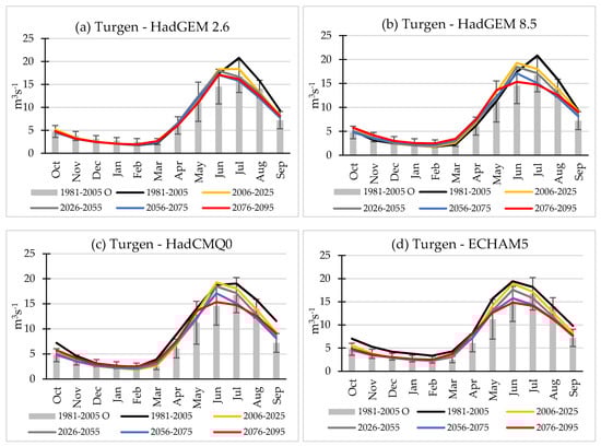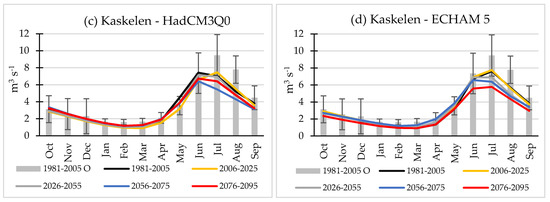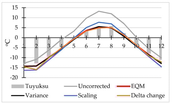 Figure 3 presents a comparison of mean monthly temperature values the simulation driven by ECHAM 5 model. The EQM and VARI methods performed best in the correction of temperature projections in this study in line with previous comparisons for western China [43]. The EQM-corrected data were selected to force the hydrological model as this method showed a marginal advantage over the VARI method.