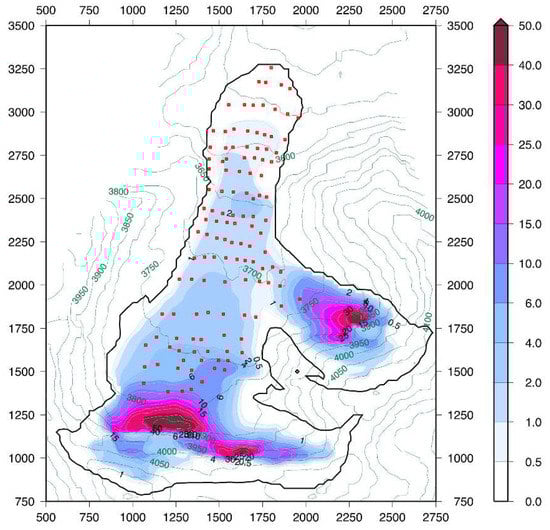 The ice flow model was calibrated against the observed values of ice flow velocities derived from the annual displacement of ablation stakes on the Tuyuksu glacier (Section 3.1; Table 2). The key parameters of the model were selected to achieve the best fit between simulated and observed ice flow velocities in the coinciding or closest grid points for fixed glacier geometry. To constrain surface velocity we used an approach described in [46] which is based on the least square fit of the simulated annual mean velocities to the observed annual displacement of ablation stakes. The outcomes of the model calibration were specific mass balance and surface flow velocity field simulated with a 25 m spatial resolution. The modelled surface flow velocities are shown in Figure 4. As expected, the simulated pattern shows maxima on the steepest slopes in the accumulation zone of the Tuyuksu and its tributary and low velocities in the ablation zone.