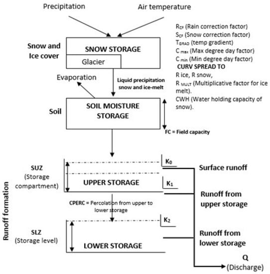 The HBV model is a classic conceptual runoff [53] model which exists in several versions. Already in the 1990s, a glacier routine has been implemented into the HBV structure, now referred to as “HBV-ETH” model [31]. Since then, further developments, especially in melt calculation and calibration, have been implemented and the model was applied to glacierized catchments in the Alps [54], the Rocky Mountains [55], the Hindukush-Karakoram-Himalayas [29,31], the Tien Shan [16,27,28], the Pamirs [30], and the Caucasus [56].