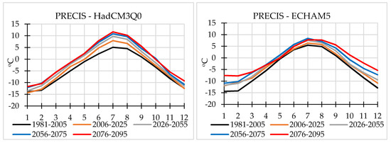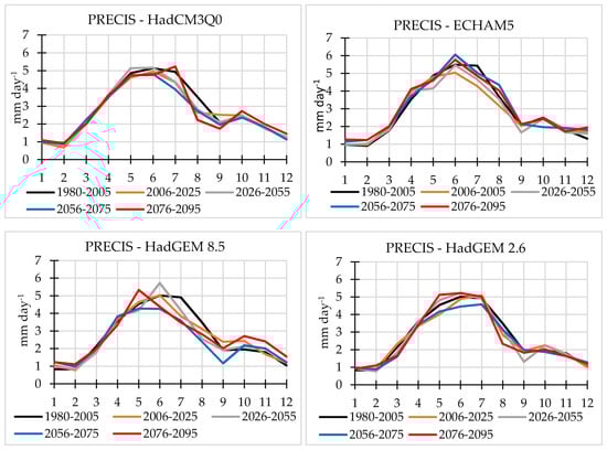 It should be noted that the ECHAM5-driven simulation projects a decline in summer precipitation in the 2006–2025 period in comparison with the baseline period: 22% in July and 14% in August. This is followed by an increase in precipitation towards the end of the century (Figure 7).