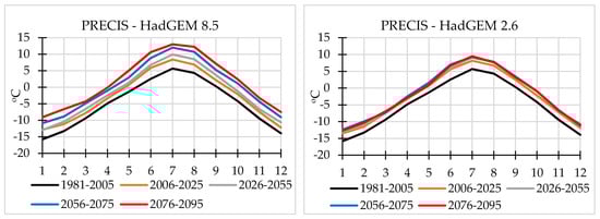 Air temperature scenarios for the study region. Note an increase in air temperature in the first quarter of the century under HadGEM 2.6 scenario and a continuing increase in temperature under HadGEM 8.5 scenario.