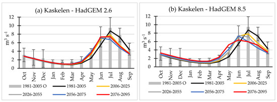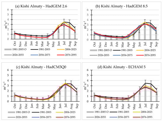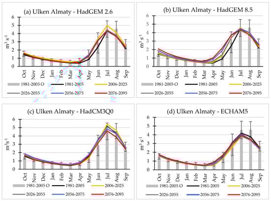 An increase in May–June flow, dominated by snow melt, and/or displacement of seasonal high flow from July–August to May–June are projected for most catchment—scenario combinations (Table 6; Figure 12, Figure 13, Figure 14, Figure 15 and Figure 16). In particular, in the high-elevation Talgar catchment, spring flow is projected to increase by the factor of 1.5–2.5 under the HadGEM8.5-driven scenario whereby snow melt occurs at earlier stages and at higher elevations.