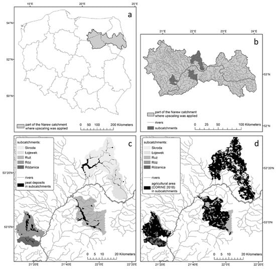 Location of study area: (a) part of the Narew catchment where upscaling was applied in relation to the territory of Poland (please note that the whole catchment of Biebrza was excluded from the analyses); (b) studied sub-catchments in the Narew catchment; (c) peat deposits in sub-catchments [35]; (d) agricultural area in sub-catchments [36].