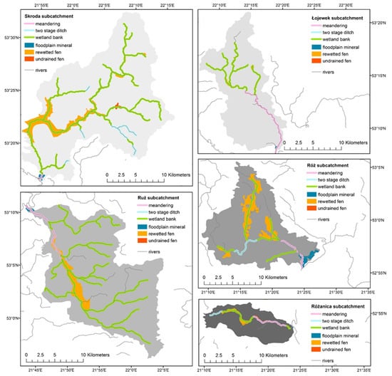 Finally, we calculated the area of polygonal WBZs. The percentage of peatlands in the five sub-catchments as well as in the Narew catchment were found to be similar (around 7%; [35]) and both the sub-catchments and the whole Narew catchment consist primarily of agricultural land. Thus, we assumed that the percentage of land covered by WBZs as well as share of different types of potential polygonal WBZs in the Narew catchment are the same as in the sub-catchments.