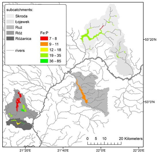 The risk of P load to downstream systems is increased if the rewetted, degraded fen has low molar Fe:P ratios (<10). Among WBZs in target sub-catchments, we identified three polygonal WBZs with potential for P mobilization (one in Róż, one in Ruż, and one in Skroda sub-catchment; Figure 3, Table 3). Excessive P loss from rewetted fens can be mitigated downstream by floodplain-type WBZs or prevented in situ by removing the top layer of degraded peat [51].