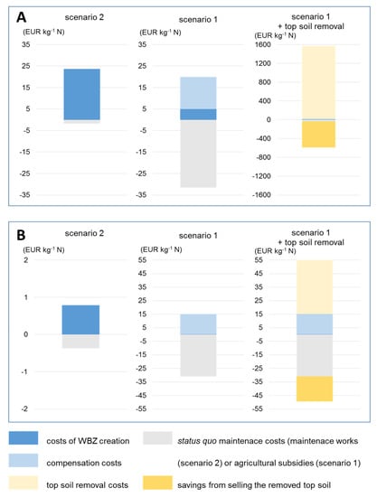 Costs of creation and functioning of WBZs in scenario 1 (with or without the top soil removal option) and scenario 2; averaged for five sub-catchments; N removal assessed in a “median” variant. (A) Costs re-calculated for the amount of N removed in one year, compensation costs and current status quo maintenance costs spent in one year. (B) Costs re-calculated for the amount of N removed in 30 years, compensation costs and status quo maintenance costs spent in 30 years (assuming maintenance works performed every five years). Agricultural subsidies include current direct payment (319 EUR ha−1 year−1—in a farm of 3–30 ha, with one cow per hectare [60] and agri-environment-climate schemes payment (on average 248 EUR ha−1 year−1).