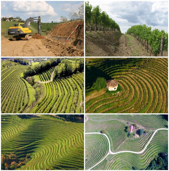 Terraced landscapes built and maintained by agricultural machinery. (a) Building new terraces in 2006 in Medana, Gorizia Hills, Slovenia (photo by Lucija Ažman Momirski). (b) Newly planted vineyard in 2006 in Medana, Gorizia Hills, Slovenia (photo by Lucija Ažman Momirski). (c) Traditional terraced landscapes in the Gorizia Hills, renewed every thirty years (photo by Lucija Ažman Momirski). (d) Bizeljsko area, Slovenia, terraced in the 1960s and 1970s (photo by Matevž Lenarčič). (e) Jeruzalem area, Slovenia, terraced in the 1960s and 1970s (photo by Matevž Lenarčič). (f) Jeruzalem area, Slovenia, terraced in the 1960s and 1970s (photo by Lucija Ažman Momirski).