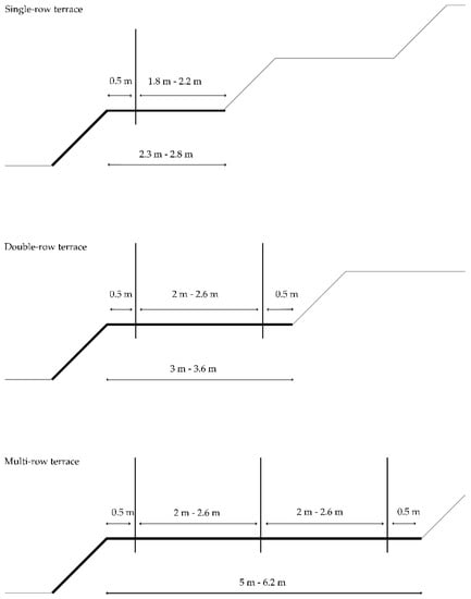 Agricultural recommendations for terrace arrangements for vineyards and orchards were considered when preparing the plan []. According to the recommendations, the vines in a vineyard can be arranged in single-row terraces, double-row terraces, double-row terraces with a passage for tractor between the row and the slope, or multi-row terraces (Figure 3). Orchards can be arranged in a single row, with fruit trees at the edge of the terrace or on the slope of the terrace [].