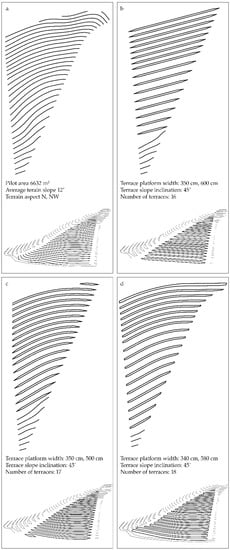 The versions differed in layout or general design concept. The first plan had only straight terraces, which would make it easier to farm (Figure 4b). In the second version, the terraces were better adapted to the terrain and partially combined the existing terrain shape, and were therefore completely curved (Figure 4c). The third and final version of the model was a more ingenious combination of the first two, which also took into account the different technical requirements for pathways, drainage, and access, and it more closely approximated the contour lines in the field (Figure 4d).