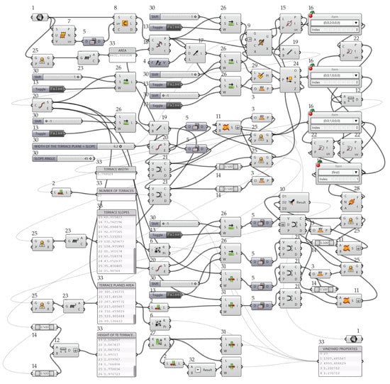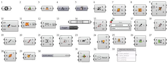 Illustration of the algorithm in Grasshopper that allows the combinatorial simulation of 3D terrace slope models by changing selected parameters. The individual components of the algorithm are: 1: surface parameter; 2: measure the length of a list; 3: world XY plane; 4: unit vector on {z} axis; 5: flip a matrix-like data tree; 6: perform mass addition; 7: divide surface; 8: create an interpolated curve on a surface; 9: rotate an object around a center point and an axis vector; 10: merge data streams; 11: create a surface between two curves; 12: compute Euclidean distance between two point coordinates; 13: Boolean (true/false) toggle; 14: evaluates a curve at a specific location; 15: solve intersection event for a line and a plane; 16: pick a single item from a data tree; 17: create a line segment defined by a start point, tangent, and length; 18: create an interpolated curve through a set of points; 19: create a line between two points; 20: represents a collection of 3D point coordinates; 21: represents a collection of 3D point coordinates; 22: solve intersection events for a curve and a plane; 23: solve area properties; 24: deconstruct a plane into its component parts; 25: project an object onto a plane; 26: offset all items in a list; 27: sort a list of numeric keys; 28: planes are defined by an origin point and three-axis vectors; 29: create a plane from a line and a point; 30: the setting of individual numeric values; 31: retrieve a specific item from a list; 32: subtraction command; and 33: text panel.