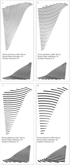 In the last type of terraces—three-row terraces or multi-row terraces—the width of the terrace platform is between 500 cm and 620 cm. With the width of the terrace platform of 500 cm and the inclination of the terrace slope of 90°, 66°, and 45°, the number of terraces decreases to 33, 29, and 26 (Figure 6c). The minimum heights of the terraces are 72 cm, 99 cm, and 127 cm, and the maximum heights of the terraces reach 124 cm, 182 cm, and 220 cm with usage index Tx at 0.96, 0.83, and 0.75. With a maximum terrace platform width of the multi-row terraces of 620 cm and the same sequence of slope terrace inclinations, we obtain Tx 0.95, 082, and 0.75. The number of terraces decreases and is only 27, 23, and 21 (Figure 6d). The minimum height of the terraces is between 87 cm, 124 cm, and 161 cm, and the maximum terrace heights are between 150 cm, 218 cm, and up to an extreme of 278 cm.