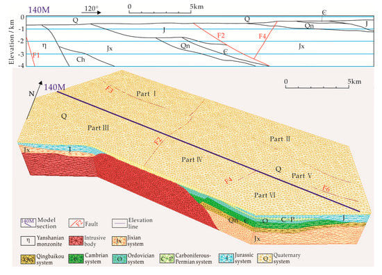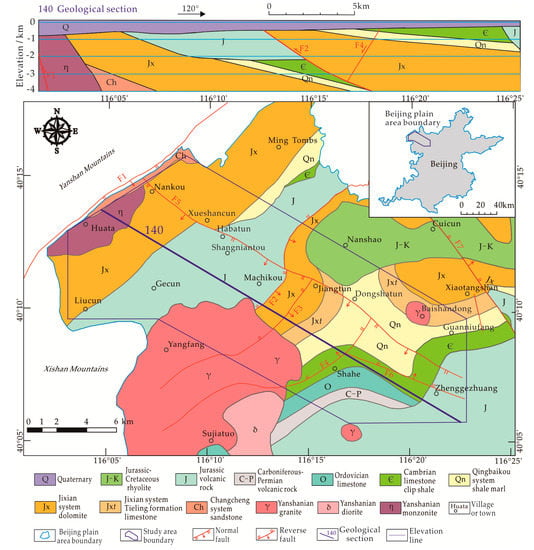 The geotectonic location of the study area belongs to the eastern margin of the Yanshanian platform fold belt in the north of the China–North Korea Paraplatform []. Fault F3 (Nankou fault) belongs to the Nankou–Sunhe fractured zone, which is a Quaternary active fault. The F3 is a normal-dip-slip fault, with the strike northwest and the dip southwest []. Fault F2 (Yingbishan fault) is cut by F3 in the middle, with the strike northeast and the dip southeast. The strata on different sides of F2 have a big gap and differences (Figure 1, 140 geological section). Fault F4 (Shahe fault) is a normal fault with a length of 16 km, with the strike northeast and the dip northwest. Cut by F4, Fault F6 (Zhenggezhuang fault) is a normal fault with a length of 13 km, with the strike northwest and the dip northeast. There are Yanshanian granitic intrusions in the Yangfang and the east of Baishan Town, respectively []. The Yanshanian monzonitic intrusion is developed in Huata in the west []. These intrusions not only squeeze the space of the heat reservoir but also affect the recharge, runoff, and discharge of groundwater [].