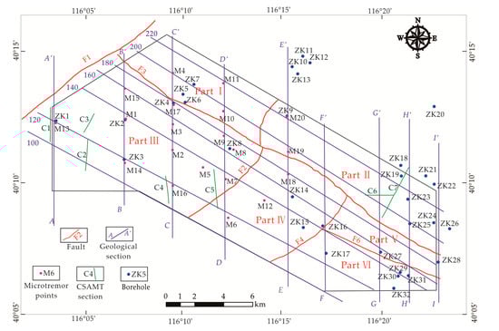 The 3D geological modeling data were mainly drawn by using the results of comprehensive geophysical surveys such as gravity, magnetic method, electrical sounding, and microtremor survey. Through the area gravity survey work in the study area, the framework of the fault structure was divided, and the uplift and sag of the bedrock were identified. Carrying out the area magnetic prospecting work in the study area, the distribution range of each intrusive body was studied. The study carried out radon measurement and arranged seven comprehensive sections with a total length of 17 km (Figure 2) for controllable source audio frequency magnetotelluric sounding (CSAMT), which determined the location of faults, the condition of deep strata, etc. The study laid out 20 microtremor points (Figure 2) to make clear the burial depth of the heat reservoir and assemblage characteristics of caprocks.