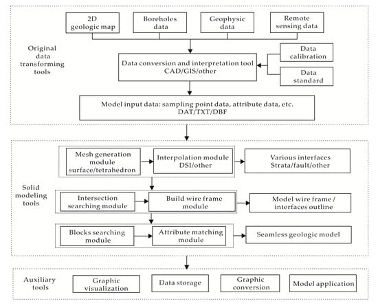 3D geological modeling has many functions, including the visualization of 3D scenes, the accurate calculation of reserves and the correctness checking of original data []. The ROCKModel adopted in this 3D geological modeling was the software independently developed by the research group of Nengxiong Xu, and its overall framework is shown in Figure 3. The software includes three parts: original data transforming tools, solid modeling tools, and auxiliary tools. The ROCKModel can build and visualize models for complex geological objects and provide geometric models for numerical simulation [].