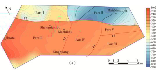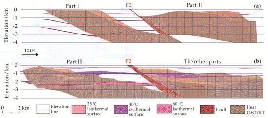 The elevations of 25 °C isothermal surfaces of Parts Ⅰ and Ⅱ were −513 m and −679 m, respectively, while the average heights of isothermal surfaces in Part Ⅲ and the other parts were −400 to −300 m. Divided by Fault F3, it was up to 300 m for the difference of the average elevations of 25 °C isothermal surfaces between the hanging wall (Part Ⅰ and Ⅱ) and the footwall (Part Ⅲ and the other parts; Figure 7a). The reason for this was that, between two walls of F3, the thickness of the Quaternary sedimentary caprocks had a difference of more than 500 m, and the geothermal gradient of the Quaternary caprock was much higher than other strata.
