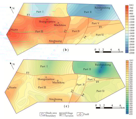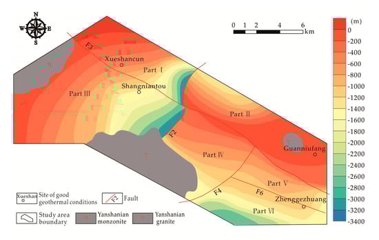The presence of intrusive bodies in the area affected the fluctuations of isothermal surfaces. In Parts Ⅱ and Ⅲ, the geothermal gradient values of the intrusive bodies had large differences, resulting in the minimum and maximum elevations of 40 °C and 60 °C isothermal surfaces in the study area. In Huata and Xinzhuang of Part Ⅲ, because of intrusive rocks, the burial depths of 40 °C and 60 °C isothermal surfaces are shallow (Figure 7b,c), while in Baishandong of Part Ⅱ, the intrusive body caused the burial depths of 40 °C and 60 °C isothermal surfaces to be deeper. The average elevation of 40 °C isothermal surface of Part Ⅱ was −1707 m, while the other parts were −1500 to −1000 m. Due to the sag of the basement in the Shangniantou area of Part Ⅲ, the burial depths of 40 °C and 60 °C isothermal surfaces were shallower. In the study area, the morphology of isothermal surfaces was mainly related to the fault structures, basement form, lithology, and thickness of the important caprock.