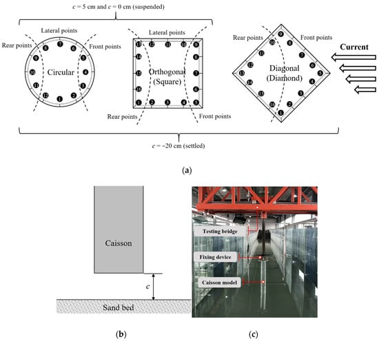 Two cross-sections (circular and square) of caisson models were chosen for the experiments, as shown in Figure 2a. The diameter of the circular caisson and the dimensions of the square caissons were both 0.15 m. Figure 2b shows the side view of the caisson suspended in water. In this study, c refers to the clearance between the caisson bottom and the sand bed, which was set to 5 cm and 0 cm. A value of c equal to −20 cm represents the caisson settled into the sediment. The circular and square caissons (orthogonal and diagonal) were used to study the local scour around caissons settled into the sediment (c = −20 cm). When the caisson was suspended in water, the circular and square caissons (orthogonal) were used to study the difference in local scour between unidirectional current and tidal current. In order to distinguish the caissons more clearly, in this paper, the square caisson orthogonal to the direction of the current is referred to as the square caisson, and the square caisson diagonal to the direction of the current is referred to as the diamond caisson. Twelve measuring points (circular) and 16 measuring points (square/diamond) were evenly arranged around the caisson at the same distance to monitor the scour depth around the caissons. These measuring points along the boundary of the caissons were divided into front points, rear points, or lateral points to investigate the development of local scour, as shown in Figure 2a.