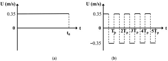 In the tests, two types of current (unidirectional current and tidal current) were used to study the local scour around caissons. The unidirectional current always flowed along the positive direction of the Y axis in the flume and remained at a constant velocity of 0.35 m/s. The velocity of the tidal current also remained constant at 0.35 m/s, but its direction of flow changed every 5 min along the positive and negative directions of the Y axis. The period (Tp) of tidal current was 10 min, which was also adopted by Vasquez and Walsh [39]. The velocity and direction versus time for unidirectional current and tidal current in the experiments are shown in Figure 4. The quantities t0 and Tp represent the duration of unidirectional current and period of tidal current, respectively.