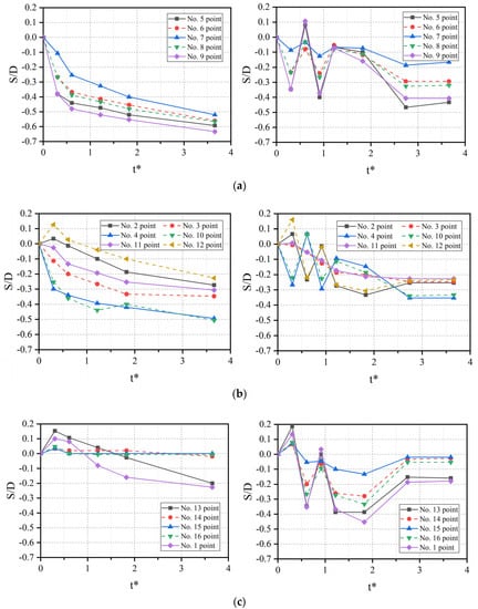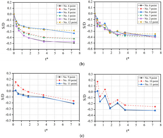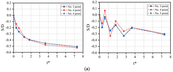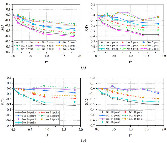 It can be clearly seen from Figure 5b that the time development of the scour depth around the circular caisson changed up and down under tidal current, and the maximum scour depth appeared at the two side points (Nos. 1 and 7). The scour pit showed a strong symmetry on both the X and Y axes under tidal current. The maximum scour depth for tidal current was smaller than that for unidirectional current at t* = 7.32 (t = 120 min). This was due to the backfilling and deposition of the sediment caused by the tidal current, which led to the reduction in scour depth. The maximum scour depth at t* = 3.66 (t = 60 min) was as high as 95% of the maximum scour depth at t* = 7.32 (t = 120 min). This suggests that the development of the scour depth around the caisson was relatively slow, which also shows that it was reasonable to set the scour time at t* = 3.66 (t = 60 min) under tidal current for subsequent cases.