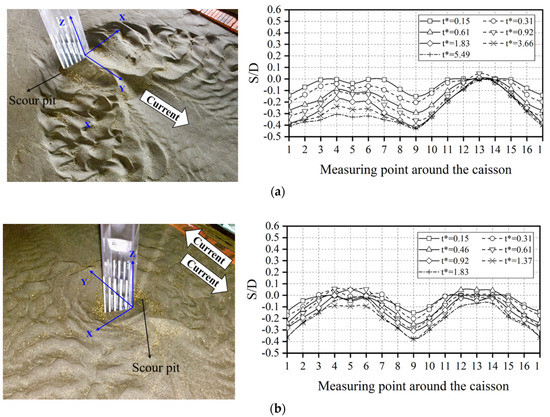 Figure 7 shows photographs of scour pits and the non-dimensional scour depth around the square caisson under unidirectional current and tidal current. As shown in Figure 7a, under the unidirectional current, the scour depth at the upstream corners (Nos. 5 and 9) occurred at the first points. Sediments washed out from the upstream corners were deposited at the two downstream corners, Nos. 1 and 13. The scour was propagated from the upstream corners toward the downstream corners and also toward the central part of the upstream boundary. In the beginning stage t* < 0.61 (t < 10 min), the scour of the caisson boundary developed slower than at the upstream corners of the caisson. After 10 min, the scour of the caisson boundary developed quickly. Then, the scour depth of the caisson boundary gradually approached the scour depth of the upstream corners. After 180 min of scour, the maximum scour depth of the caisson boundary was about 93% of the maximum scour depth of the upstream corners. The maximum scour depth at t* = 10.97 (t = 180 min) occurred at the upstream corners (Nos. 5 and 9).