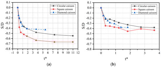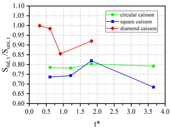Figure 12 shows values of the scour depth ratio Stid,t/Suni,t for different cross-sections of caissons as a function of non-dimensional time t*. Stid,t represents the maximum scour depth under the action of tidal current at time t* and Suni,t represents the maximum scour depth under the action of unidirectional current at time t*. The scour depth ratio Stid,t/Suni,t can reflect the degree to which the scour depth of caissons with different cross-sections is affected by tidal current. The larger the Stid,t/Suni,t ratio is, the less sensitive the caisson with this cross-section is to tidal current. Compared with the scour under unidirectional current, the square caisson was more sensitive, while the diamond caisson was less sensitive to the tidal current.
