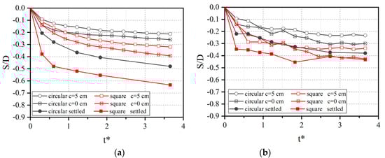 Figure 13 shows the development of the maximum scour depth with time when the caisson was suspended in water or settled into the sediment. When the caisson was suspended in water (c = 5 and 0 cm), the maximum scour depth of tidal current was larger than that of unidirectional current no matter what the cross-section of the caisson. This shows that, under tidal current, when the caisson was suspended in water, the sediment under the caisson was easily washed away without the shelter of the caisson. The change in direction of tidal current results in the backfilling and deposition of sediment, most of which consisted of fine particles that were easily washed away. It can also be seen from the results of these experiments that when the fine particles were backfilled and deposited in the scour pit, they were immediately washed away, and the coarse particles were left in the scour pit. The coarse particles rolled, jumped, and slid in the scour pit with the change in direction of the tidal current, which caused the fine particles underneath the coarse particles to be exposed and transported by the water flow. However, the coarse particles in the scour pit were relatively stable under unidirectional current. Therefore, the maximum scour depth of tidal current was larger than that of unidirectional current when the caisson was suspended in water. When the caisson was settled into the sediment, the maximum scour depth of tidal current was smaller than that of unidirectional current due to the shielding effect of the caisson. The maximum scour depth and the development of the circular or square caisson both increased with the caisson gradually sinking into the sediment. Under unidirectional current, when the caisson was close to the sediment surface (c = 0 cm), the maximum scour depth of the circular caisson and the square caisson reached 54.2% and 62.1% of the value for the settled caisson, respectively. Under tidal current, the maximum scour depth of the circular caisson and the square caisson (c = 0 cm) reached 78.9% and 98.5% of the value for the settled caisson, respectively. This shows that the scour depth cannot be ignored when the caisson is suspended in water during the caisson construction stage.