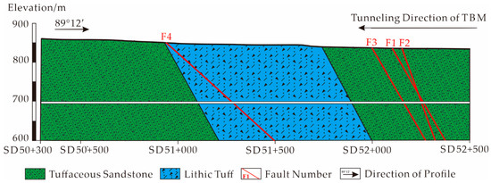 The SS tunnel is located at the junction of the northern region of the Tianshan Mountains and the Jungger Basin in Xinjiang Province, China, as shown in Figure 1. It is a typical long tunnel with a length of 31.5 km and a longitudinal slope of 1/5000, 22.7 km of which was constructed by a TBM. The excavation diameter is 5.5 m, the ground elevation along the line is 775–1005 m, the topography is not undulating, the relative height difference is 5–35 m and the overburden thickness is 80–295 m. The geological structure of the SS tunnel mainly consists of Tuffaceous sandstone and lithic tuff from SD52+500 to SD50+300, small-scale faults and joint fissures are well developed, and the width of the fault zones is 0.3–5 m. The geological section of the SS tunnel is presented as Figure 2. The surface water above the tunnel is not abundant, and there is no river passing nearby. The groundwater is mainly fissure water stored in the rock mass, but the water is abundant. It is very likely that large water inrush would occur during the TBM construction, which would seriously threaten construction safety. Actually, water inrush occurred many times in the SS tunnel during the 19 months from August 2017 to February 2019, which seriously affected the tunneling efficiency of the TBM, as shown in Figure 3. Accordingly, there is a need to assess the risk level of water inrush in this section of the SS tunnel and provide risk warning for the subsequent tunneling of the TBM.