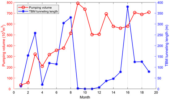 The measured data of the TBM monthly tunneling length and monthly pumping volume of the SS (Shuang-san) tunnel during the 19 months from August 2017 to February 2019.