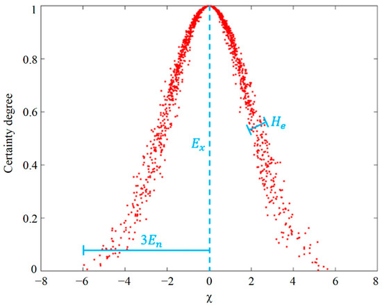 Theoretically, the distribution of on can be described by the cloud numerical characteristics . The expected value () represents the central value of the concept in the space. Entropy ( is the uncertainty measurement of the qualitative concept, which reflects the value range of the distribution of cloud drops. The dispersion degree of cloud drops can be indicated by Hyper entropy (), which can reflect the uncertainty degree of and control the thickness of cloud drops [35,36]. For instance, Figure 5 shows a normal cloud diagram, in which the cloud numerical characteristics are and .