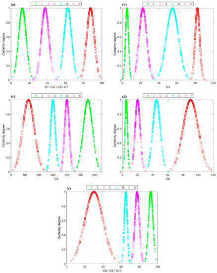 where are the maximum and minimum boundary values of the corresponding grade standard, respectively. Based on the practical situation, can be set as an appropriate constant (k < 0.5) to ensure that the cloud thickness is appropriate. In this paper, was 0.01 [37]. If a variable has only an upper or lower limit, such as or , the boundary parameters can be determined by the maximum and minimum values of the variable.