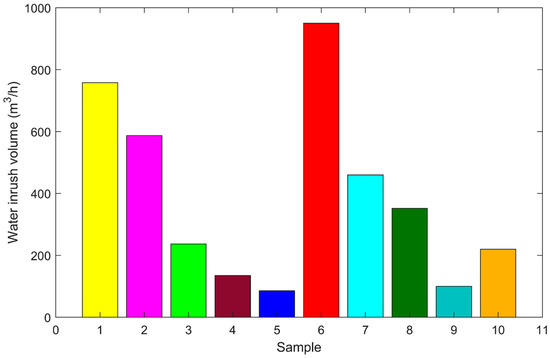 According to the statistical analysis of the location and the volume of water inrush in the SS tunnel, within the study area from SD52+160 to SD50+617, the measured maximum water inrush volumes of the ten samples are presented as Figure 8.