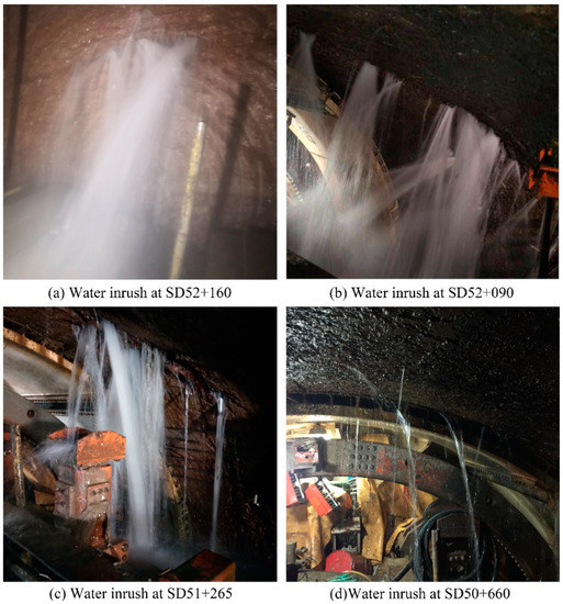 Practical situation of water inrush in the SS (Shuang-san) tunnel. (a) water inrush at SD52+160; (b) water inrush at SD52+090; (c) water inrush at SD51+265; (d) water inrush at SD50+660.