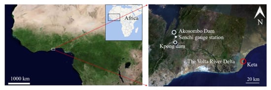 The Akosombo and Kpong Dams were built on the Volta River in 1964 and 1982, respectively. The two dams generate about 1060 MW of hydropower, providing 80% of Ghana’s electric power needs. The Akosombo Dam is about 100 km upstream from the river mouth along the river channel, and the Kpong Dam is 24 km downstream of Akosombo along the river channel. The reservoir capacity and area for the Akosombo Dam are 147,960 million m3 and 8482.250 km2, whereas those for the Kpong Dam are 200 million m3 and 25.2 km2.