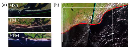 (a) Pseudo-color images using 432 bands and 543 bands for the multispectral scanner (MSS) and thematic mapper (TM)/enhanced thematic mapper (ETM+) images (b) extraction of the shoreline of the Volta River Delta. The red line is the example of extracted shoreline, and the white polygon is the intersected polygon.