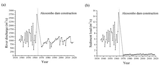 In this study, river discharge and sediment load exhibited a substantial decrease after the construction of the Akosombo Dam (Figure 3), and the beginning of the decreasing trend coincides with the time of the construction of the Akosombo Dam (Figure 4). Furthermore, the intra-annual variations of river discharge and sediment load also exhibited a significant decease after the dam construction (Table 2). Therefore, the Akosombo Dam was presumably dominant in inducing the hydrological alteration. Notably, however, the land use/land cover changes and climate change (such as rainfall) can also affect the water and sediment yield from the catchment and cause additional effects [].