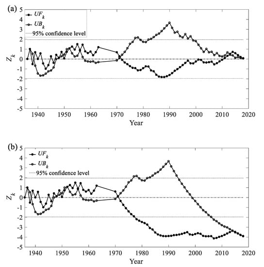 The Zk values calculated with progressive and retrograde series of X are denoted as UFk and UBk, respectively. A positive or negative UFk value represents an increasing or decreasing trend. When |UFk| < 1.96, the trend is not significant within a 95% confidence level. The intersecting points of the UFk and UBk lines indicate the beginning time of a developing trend of the time series.