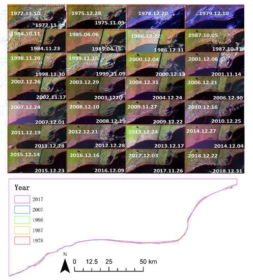 Figure 5 shows that the pseudo-color images using 432 bands and 543 bands for MSS and TM/ETM+ images, respectively, separate the land and ocean distinctly. The shorelines (shown in red lines) extracted from the Volta River Delta from 1972 to 2018 are also shown in Figure 5, and the delta area was further calculated as the area encompassed by the shoreline and the landward boundaries.