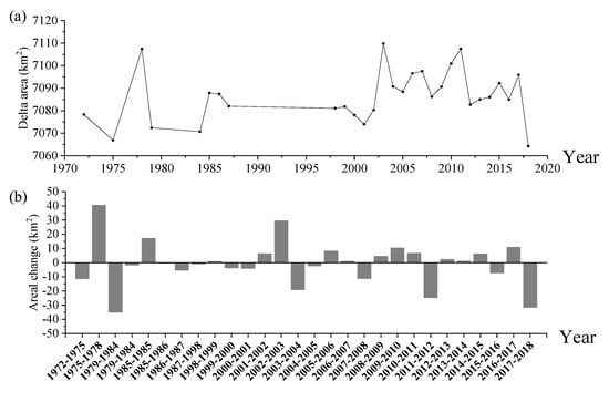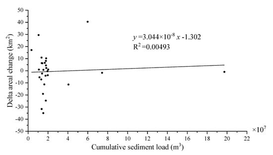 To assess the delta areal changes, the areal changes at the end of two consecutive years were calculated. A positive value represents progradation, and a negative value represents erosion. To compare the influence of sediment load on the delta areal changes, the corresponding cumulative sediment load for each period was calculated and then plotted against the associated delta areal changes following [].