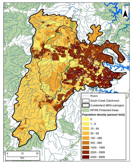 The Western part of Sydney, Australia was chosen as the location for a case study of the effect of urban development on freshwater reptile habitats. The catchment of South Creek in Western Sydney (620 km2, Figure 1) is of special interest because of the current rapid urban development [24]. To represent population densities in this region we used the 2011 census provided by the Australian Bureau of Statistics. The population densities were grouped into blocks of 500 people.