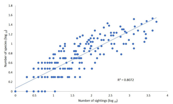 The relationship between the number of sightings made and number of species recorded within an ecoregion. Each point is a Freshwater Ecoregion of the World (FEOW) region (n = 265).
