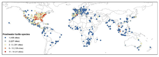 Number of freshwater turtle species sighted between January 2013 and April 2018 within 50 km of a city with a population of more than 100,000.