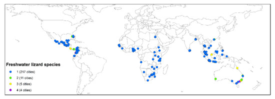 Cities of South-Eastern Australia and Western Colombia had the greatest number of freshwater lizard species, and sightings were made in many cities in Southern temperate zones in Africa and Australia (Figure 4). In contrast, very few freshwater lizard sightings were made north of the Tropic of Cancer.