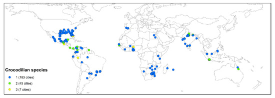 Number of crocodilian species sighted between January 2013 and April 2018 within 50 km of a city with a population of more than 100,000.