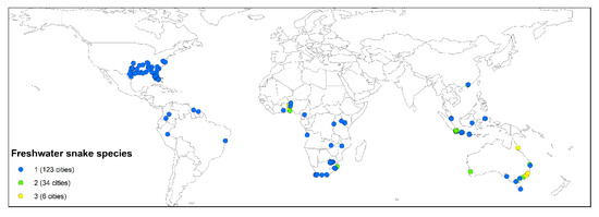 Number of freshwater snake species sighted between January 2013 and April 2018 within 50 km of a city with a population of more than 100,000.